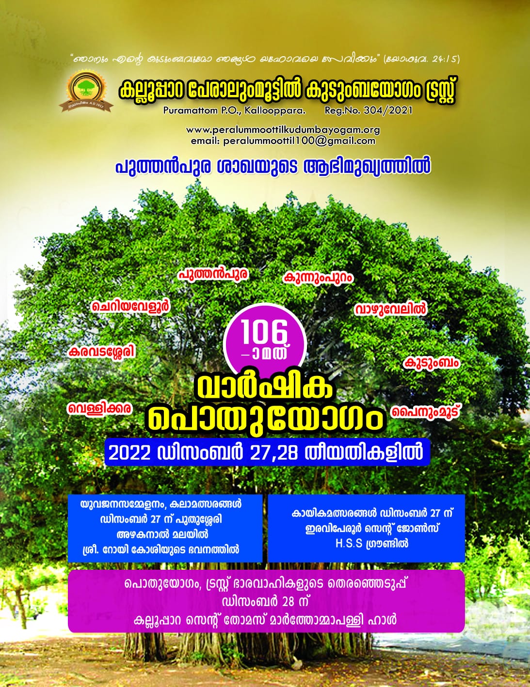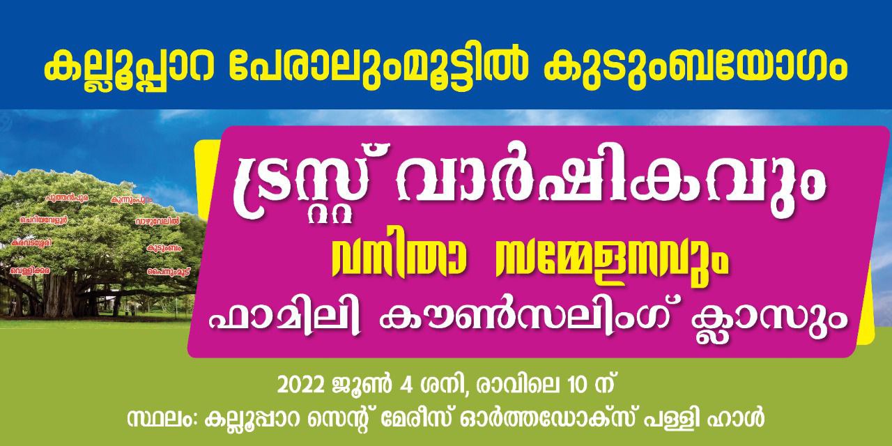 കല്ലൂഭാറ പേരാലുംമൂട്ടില് കുടുംബയോഗത്തിന്റെ 106-ാമത് വാര്ഷികവും 2023-24 ലേക്കുള്ള ട്രസ്സ് ഭാരവാഹികളുടെ തെരഞ്ഞെടുഷും യുവജനസമ്േമേളനവും കലാ- കായിക മത്സരങ്ങളും 2022 ഡിസംബര് 27,28 (ചൊവ്വ, ബുധന്) ദിവസങ