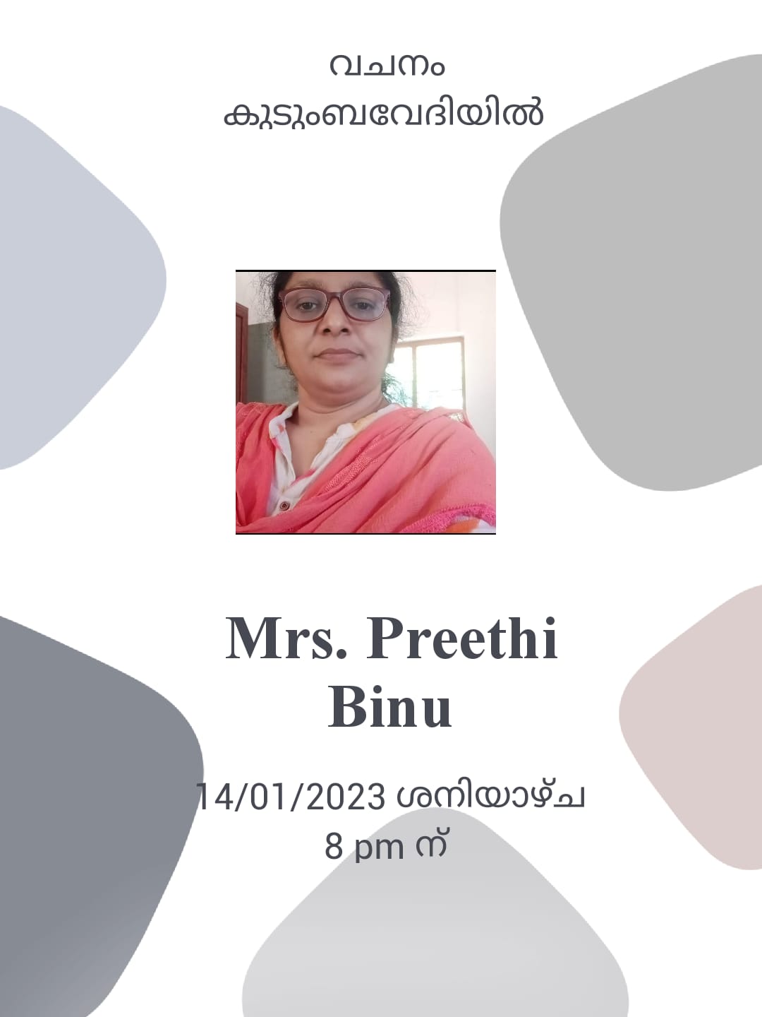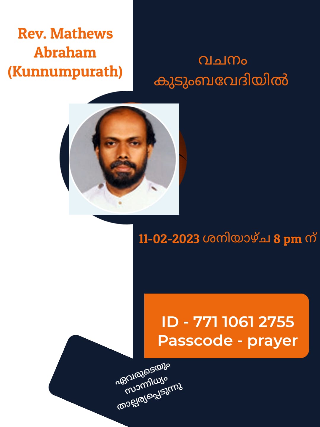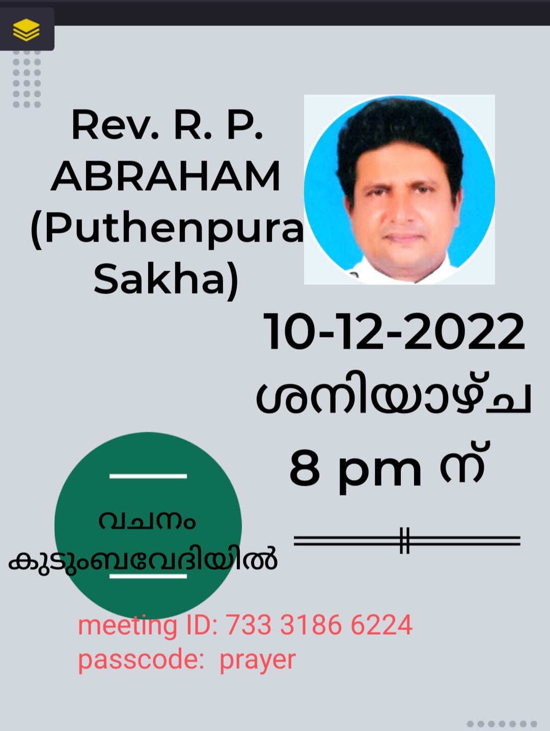 Peralummoottil Kudumbayogam is inviting you to a scheduled Zoom meeting. Topic: Vachanam Kudumbavedhiyil Time: Jan 14, 2023 08:00 PM India Meeting ID: 722 8358 9444 Passcode: prayer